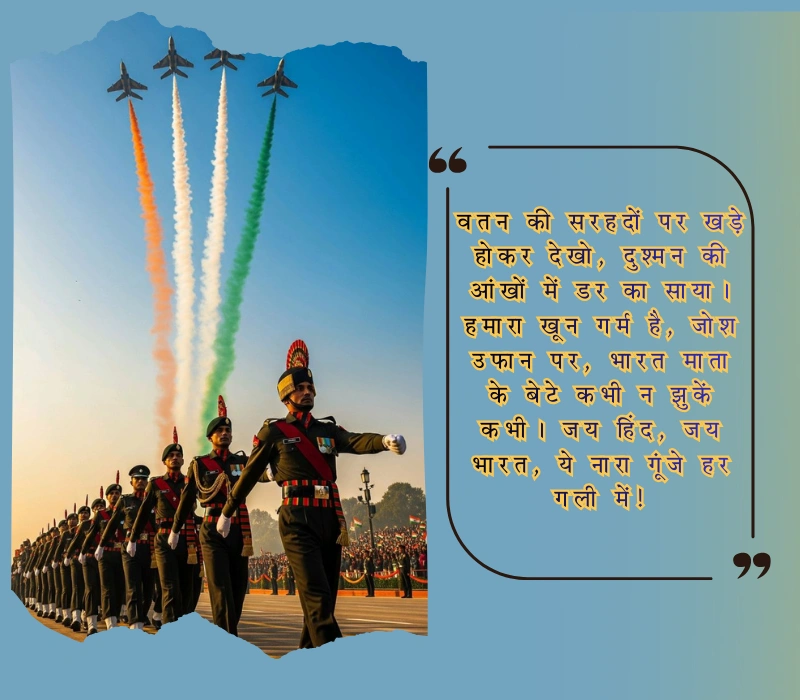 वतन की सरहदों पर खड़े होकर देखो, दुश्मन की आंखों में डर का साया। हमारा खून गर्म है, जोश उफान पर, भारत माता के बेटे कभी न झुकें कभी। जय हिंद, जय भारत, ये नारा गूंजे हर गली में!
