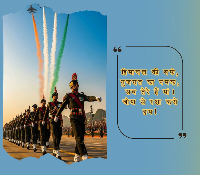 सीमा पर पहरा देते जवान, रात-दिन न सोएं, बस देश का ख्याल। मां भारती तेरी कोख से निकले वीर, जोश से लड़ें हर जंग जीत लें। तिरंगा ऊंचा रखना है, हर सांस में ये प्रण दो!