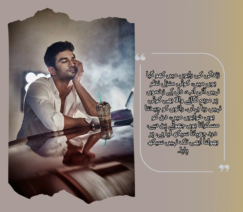 زندگی کی راہوں میں کھو گیا ہوں میں، کوئی منزل نظر نہیں آتی اب، دل کے زخموں پر مرہم لگانے والا بھی کوئی نہیں رہا یہاں۔ راتوں کو چیختا ہوں خوابوں میں، دن کو مسکراتا ہوں جھوٹے پن سے، درد چھپانا سیکھ لیا ہے، پر بھولنا ابھی تک نہیں سیکھ پایا۔
