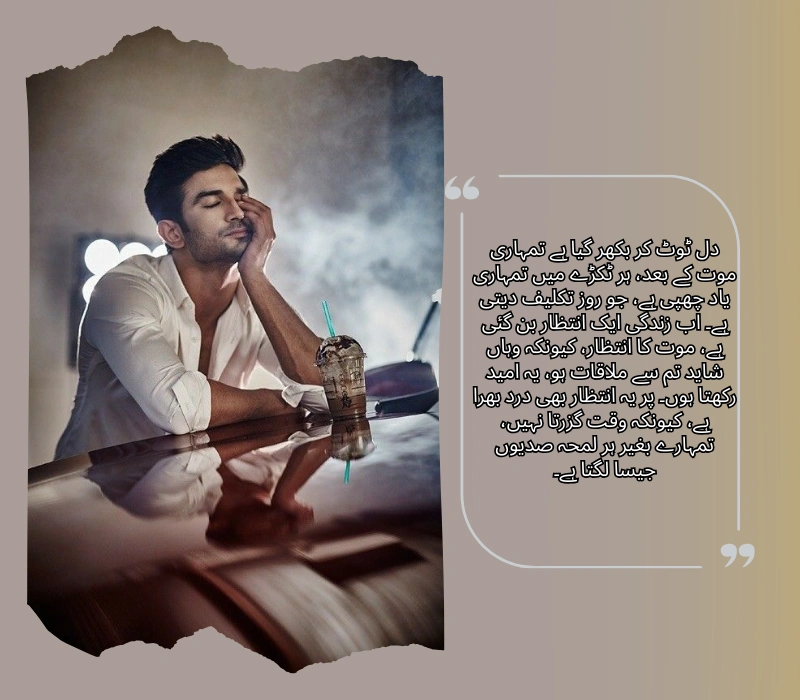 دل ٹوٹ کر بکھر گیا ہے تمہاری موت کے بعد، ہر ٹکڑے میں تمہاری یاد چھپی ہے، جو روز تکلیف دیتی ہے۔ اب زندگی ایک انتظار بن گئی ہے، موت کا انتظار، کیونکہ وہاں شاید تم سے ملاقات ہو، یہ امید رکھتا ہوں۔ پر یہ انتظار بھی درد بھرا ہے، کیونکہ وقت گزرتا نہیں، تمہارے بغیر ہر لمحہ صدیوں جیسا لگتا ہے۔